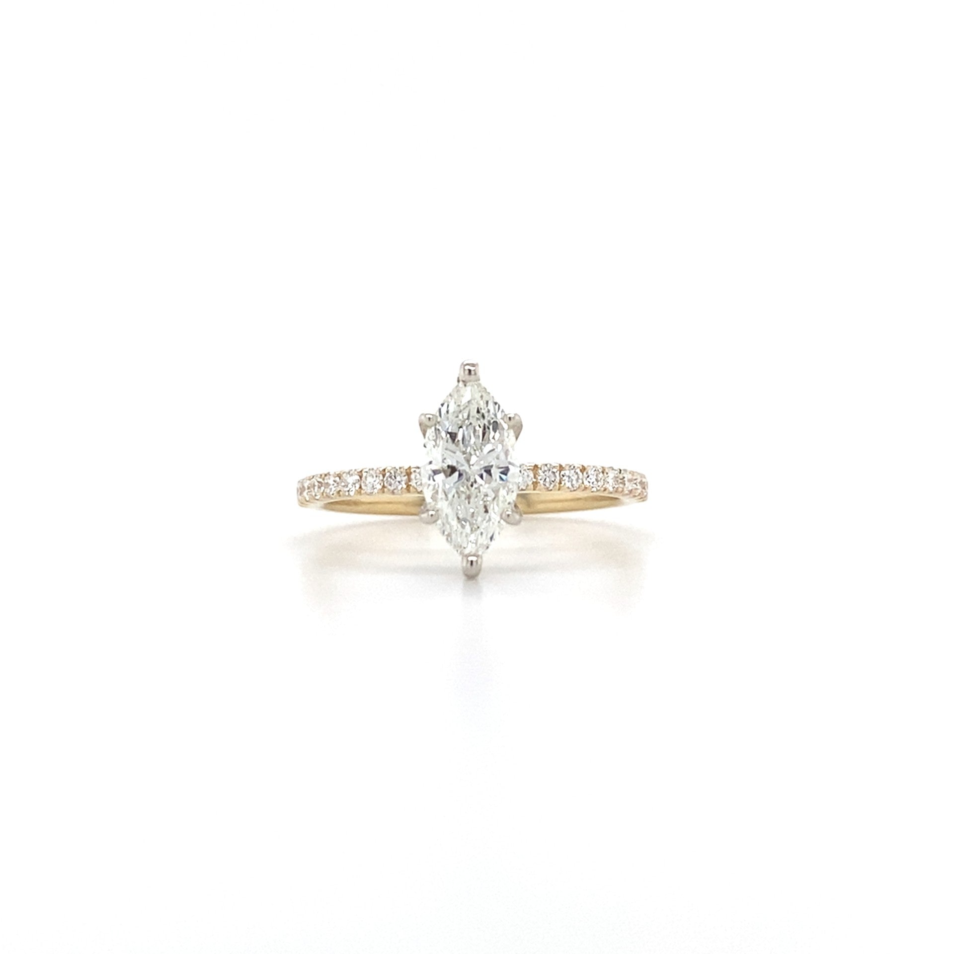 Expertly crafted with 14kt yellow gold, this stunning piece features a brilliant 1.01ct. marquise cut diamond with a color grading of G and clarity grading of SI2. There are .30ct tw of round brilliant cut diamonds accenting the band. A timeless and elegant addition to any jewelry collection with a total weight of 1.31cts.. GIA Report #1525704671