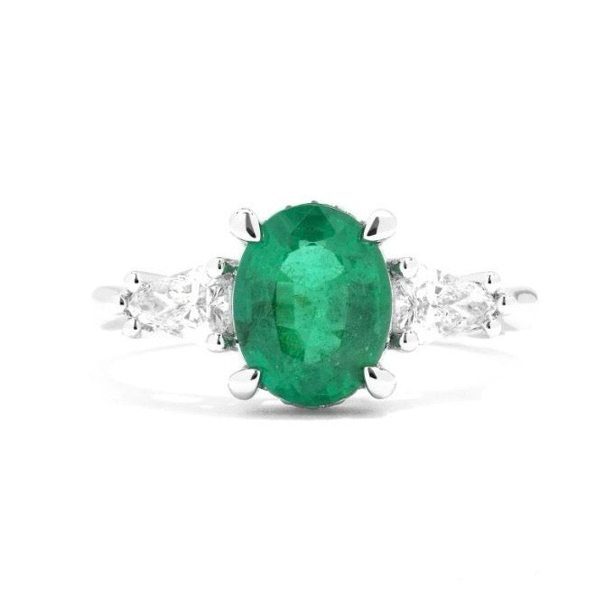 This refined platinum ring features a captivating 1.67ct oval cut emerald, exuding rich green elegance. Accented by 0.55ct of distinctive shield cut diamonds, it strikes a perfect balance of bold sophistication and radiant sparkle.