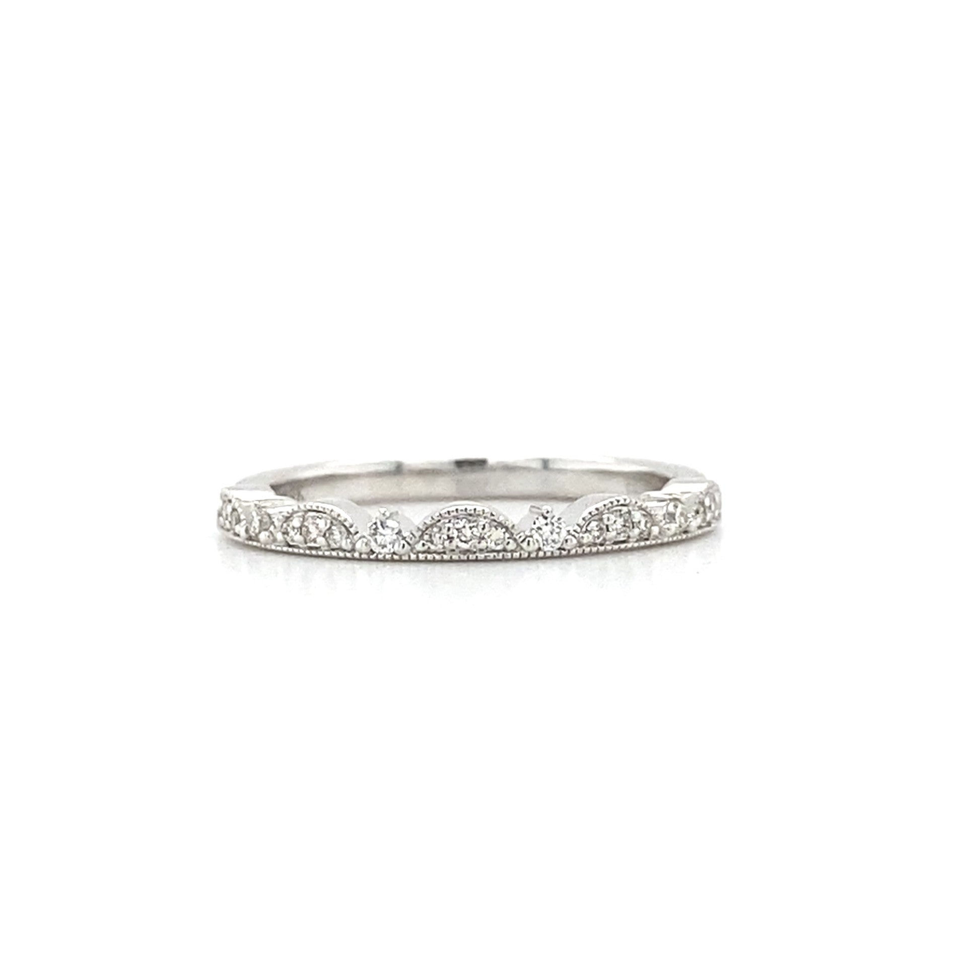 Delicate 14-karat white gold band set with diamonds totaling 0.15 carat in weight. This understated piece exemplifies refined craftsmanship, offering subtle sparkle and timeless appeal.