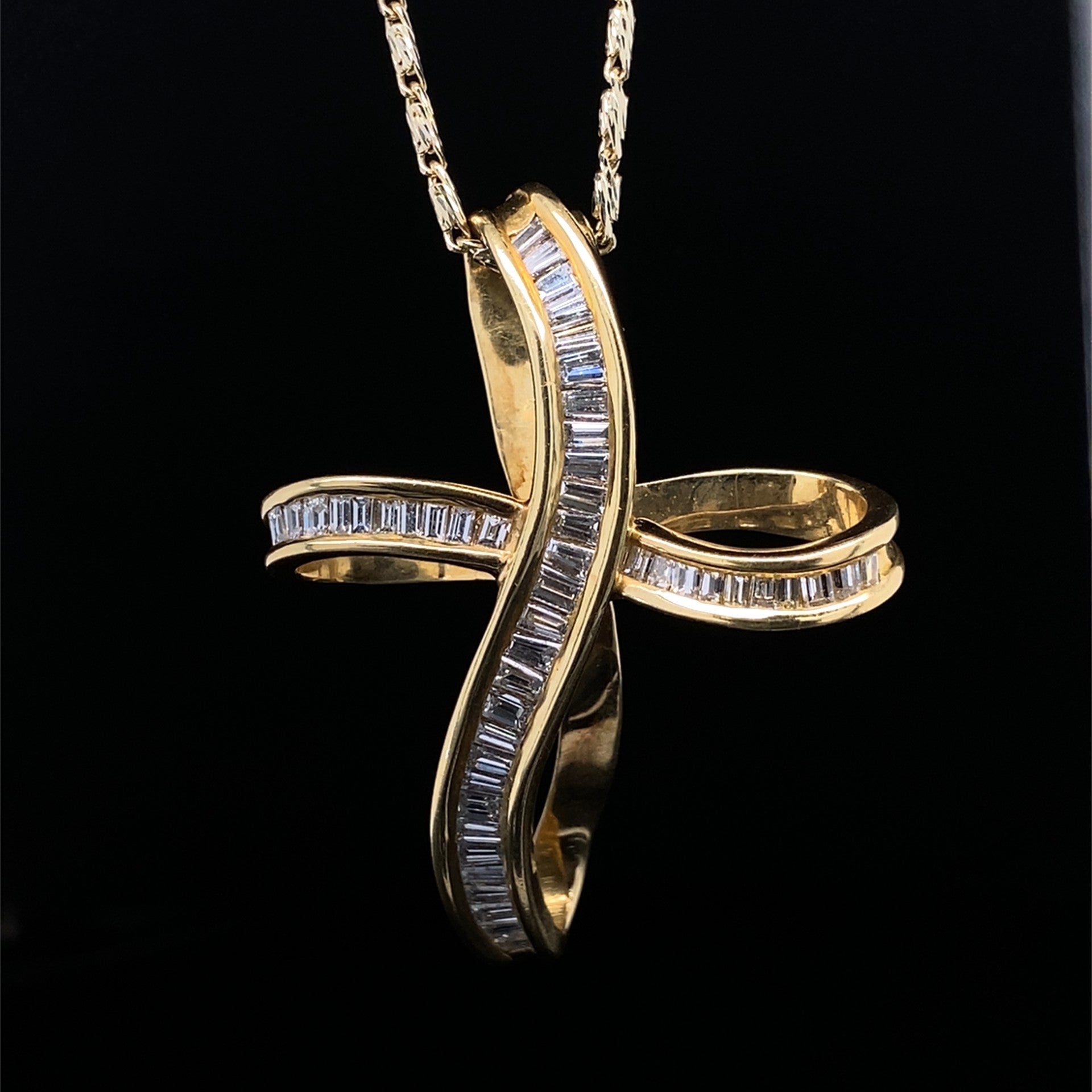 This exquisite 18kt yellow gold cross necklace features 48 baguette-cut diamonds totaling 2.08 carats, graded F-G color with VS1-VS2 clarity. The geometric precision of baguette diamonds creates a striking linear design, while the superior color and clarity grades ensure exceptional brilliance.