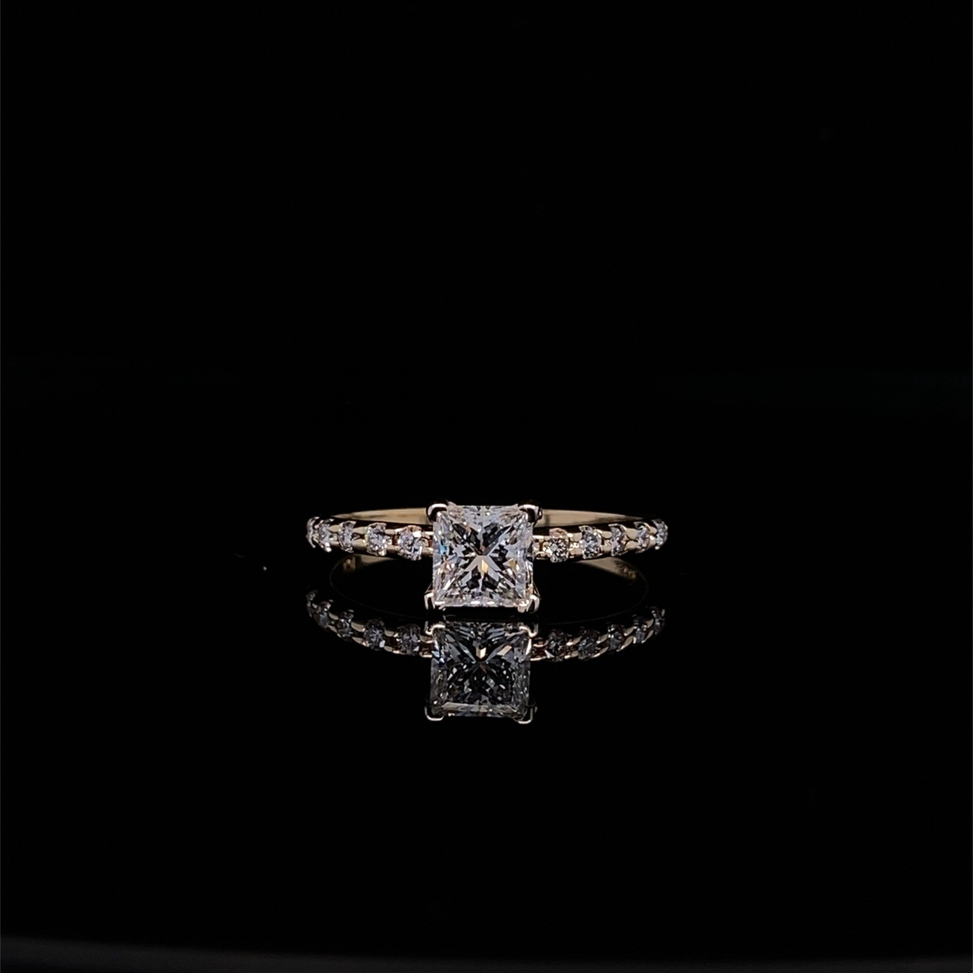 Exceptional 14-karat yellow gold engagement ring featuring a princess-cut diamond of 0.71 carat (G color, VS2 clarity) with accenting diamonds totaling 0.93 carat. Graded by GIA (Certificate #14015082), this striking piece combines contemporary design with superior diamond quality and enduring craftsmanship.