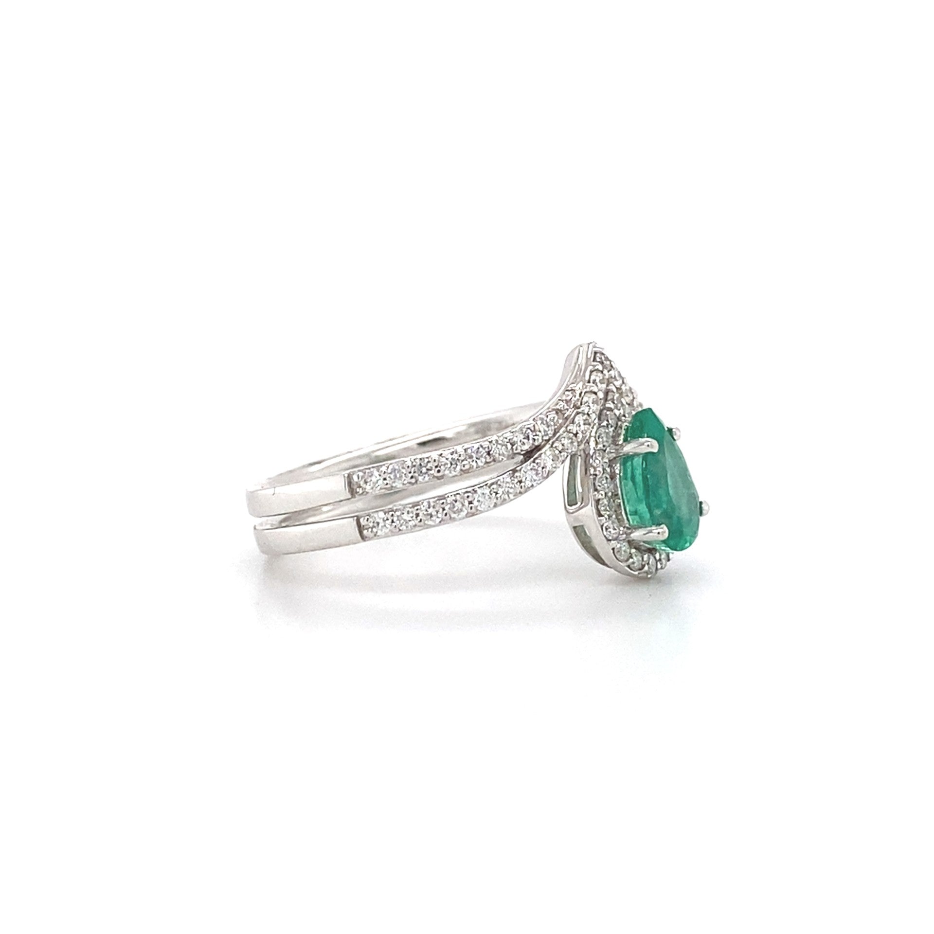 This sophisticated 14-karat white gold ring showcases a striking emerald center stone weighing 0.56 carats, complimented by diamond accents totaling 0.35 carats. The cool luminosity of white gold enhances the emerald's rich green hue.