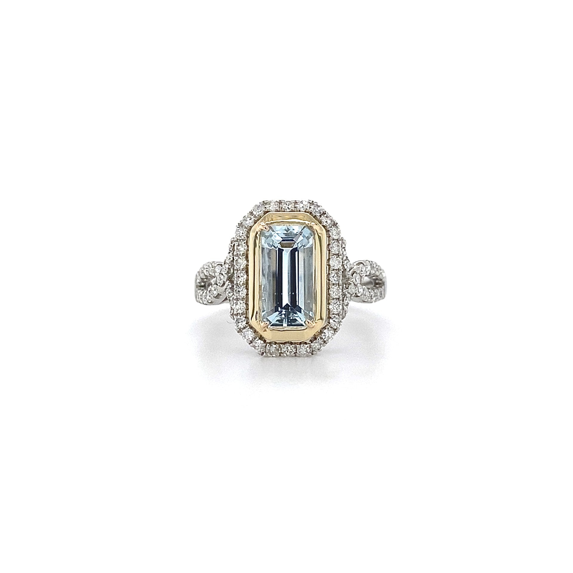 This 14kt yellow gold ring features a stunning 1.40ct aquamarine stone surrounded by 0.48ct diamonds. The combination of white and yellow gold adds a touch of elegance to this exquisite piece. Perfect for any occasion, this ring is sure to make a statement.