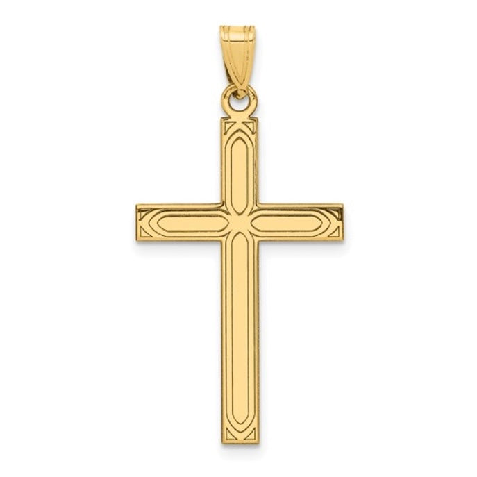 This striking 14kt yellow gold cross pendant, measuring 31 x 19mm, features an intricately etched design that adds depth and character to its timeless form. With a refined and distinctive style, this pendant is perfect for pairing with your choice of chain (not included).
