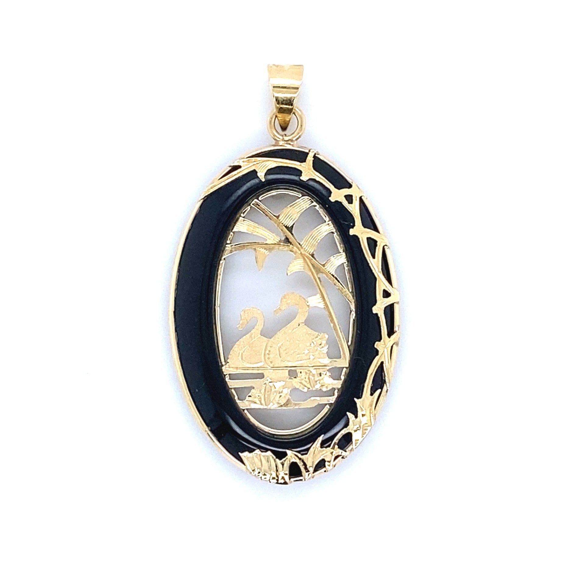 This estate pendant combines 14kt yellow gold with striking black onyx, exemplifying the refined artistry of vintage jewelry design.