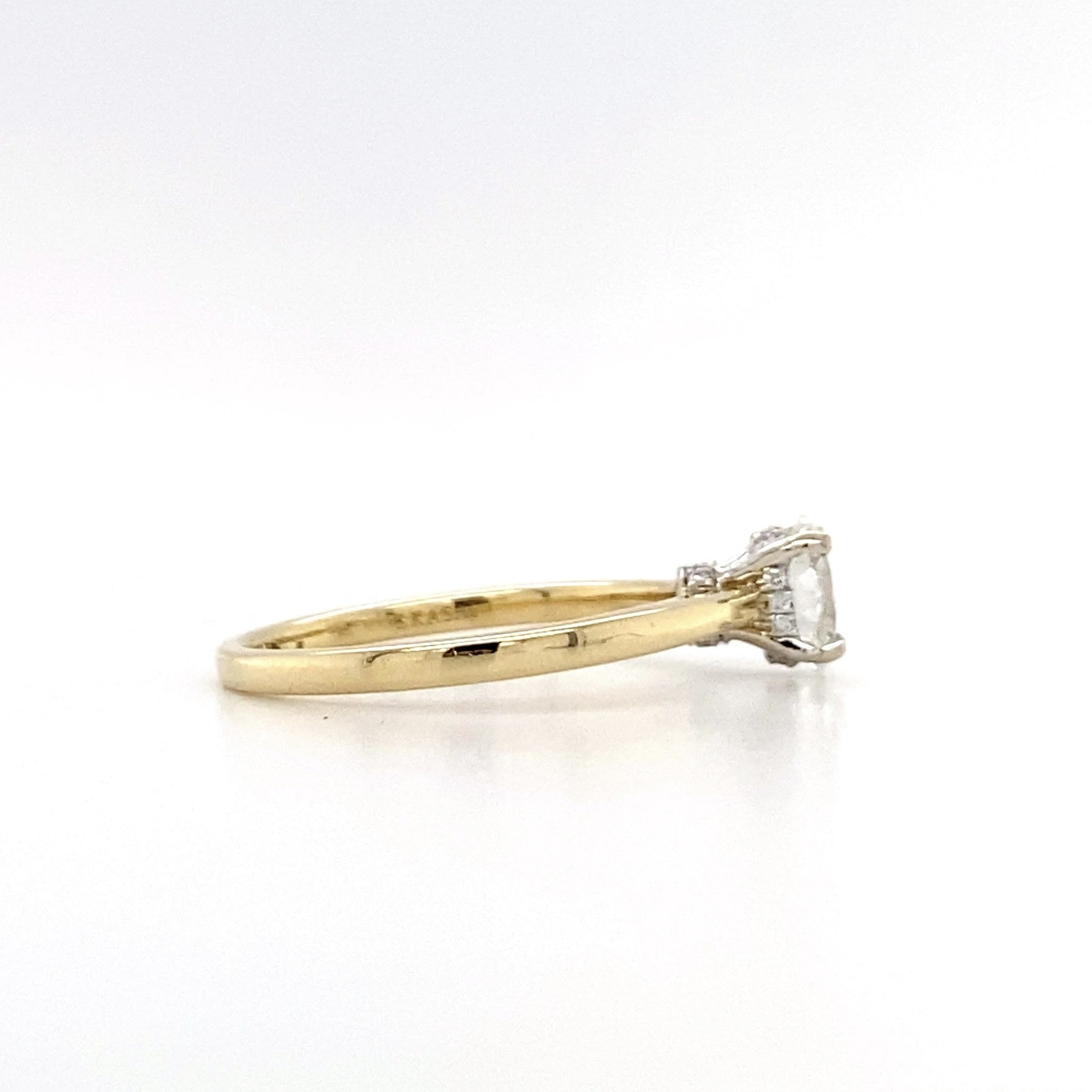 This elegant 14kt yellow gold engagement ring showcases a 0.55 carat oval diamond graded by GIA with F color and SI1 clarity. (GIA#6501358775) The total weight is 0.61 carats, combining the elongated beauty of an oval cut with exceptional quality.